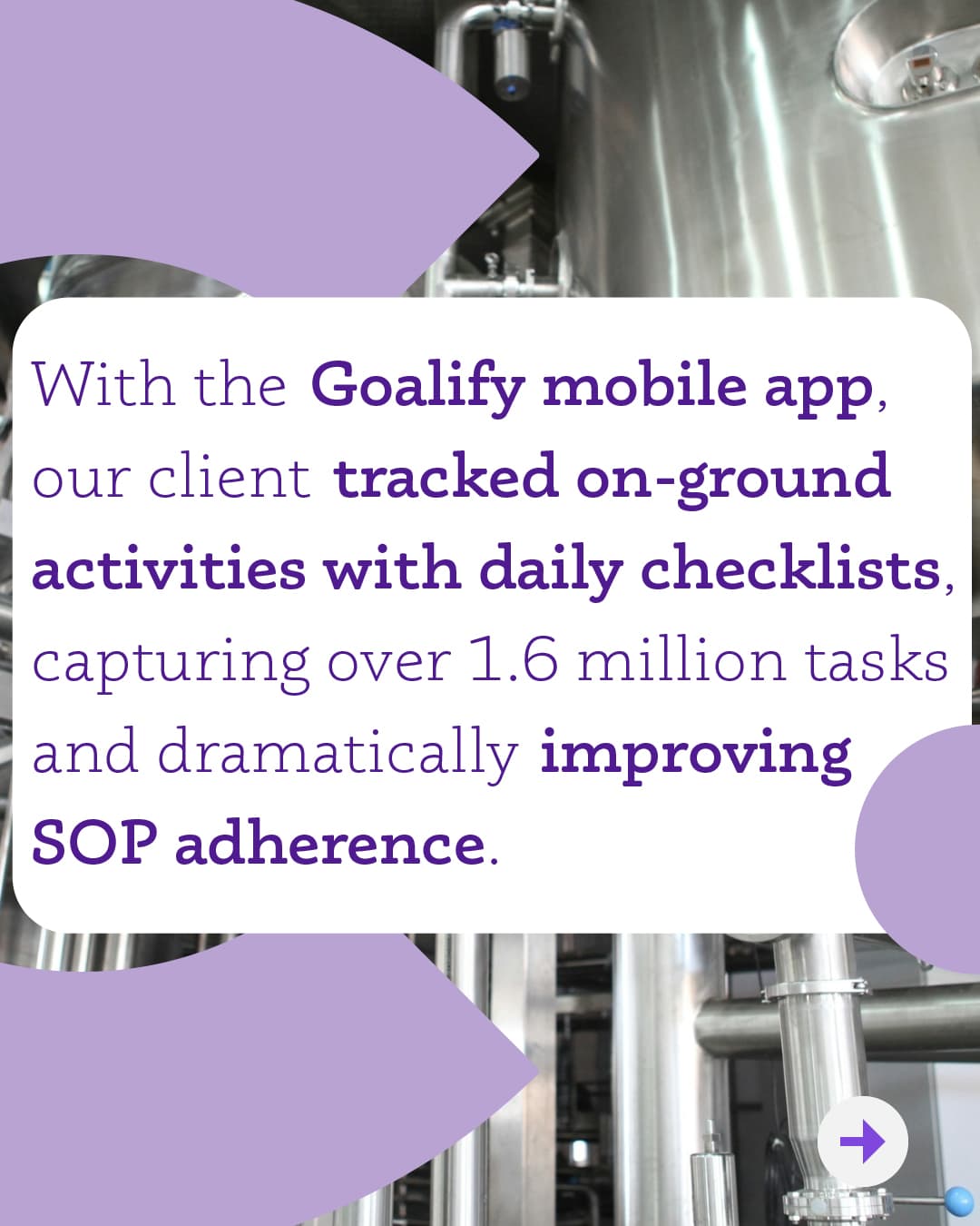 With the Goalify mobile app, our client recorded an impressive 1.6 million task completions. The daily compliance scores were seamlessly exported to a connected BI system, enabling advanced analysis and actionable operational insights. To ensure real-time visibility into progress and compliance metrics, we also implemented interactive reports and automated email updates.